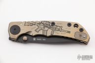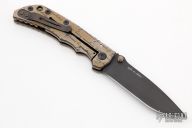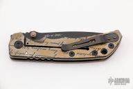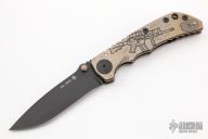 This Harsey framelock folder by Spartan Blades features a black drop point blade with dual thumbstuds and a notched thumbrest. The handle has an anodized titanium frame with a laser engraving a tip up titanium clip and filler tab. Has nice detent, lockup, and blade seating. Excellent condition.