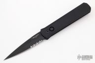 This 921 SWAT Godfather features a black partially serrated blade. The handle has a black aluminum frame with black hardware, black push button and black stainless steel tip up clip. Has some light scuffs, otherwise excellent condition.