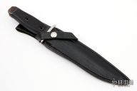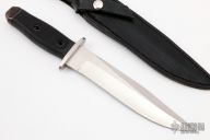 This Combat Bowie by Pat Crawford features a satin finished blade with a sharpened top edge, .178" blade stock and 1.455" blade depth, hidden tang construction. The handle has a stainless steel guard, rubber grip and black steel butt. Comes with a black leather sheath. Has a few light scratches, otherwise excellent condition.