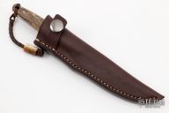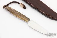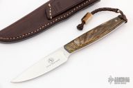 This "Bateleur" by Arno Bernard features a tumbled finished drop point blade with a notched thumbrest and a full tang construction. The handle features carved Giraffe Bone Scales. Includes a brown leather sheath. Comes with original box and papers. Excellent Condition.