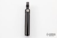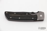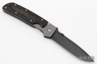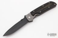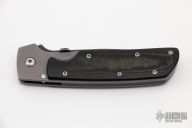 This ATCF by Bob Terzuola features a black tumbled blade with false top edge, notched thumbrest and a thumbdisc. The handle has a blasted titanium frame, black linen micarta scales with 6 screws, black backspacer, bead blasted titanium liner. Nice detent, lockup and blade seating. Excellent condition. This knife is sterile and has no markings.