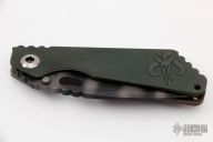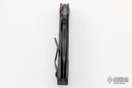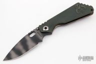This MSC SNG framelock folder by Mick Strider features a tiger striped blade and a green aluminum and flamed titanium frame and tip up titanium clip. Includes Hinderer "Lock Bar Stabilizer" for maximum reverse lock retention. Nice detent, lockup and blade seating. New condition.