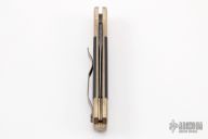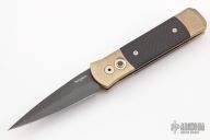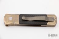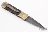 This Godson from Pro-Tech Knives features a Vegas Forge Herringbone Damascus blade with swedge. The handle has a stonewashed bronze frame with carbon fiber inlays and  button, stonewashed tip up clip. New From Maker! Comes with original box and papers.