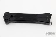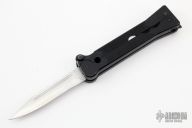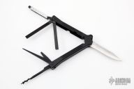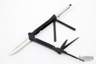 This vintage military multitool features a satin finished blade that can be deployed with the push of the button. Inside the black steel handle is a small blade, flat head screw driver, auger, spike, safety match and striker, file and sawblade. "AL754" on the handle. Has scuffs and scratches, but good condition for its age. If you know who made this or more about it, please let us know.