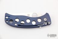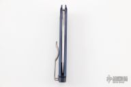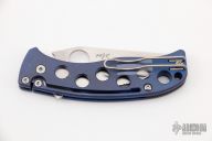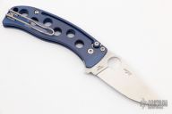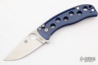 The PITS (Pie in the Sky) Folder is based on Mike Read's popular non-locking folder, which has been designed to comply with British knife laws. It has a full-flat ground N690Co steel clip point blade and precision-machined blue skeletonized titanium handle that aids in providing texture for grip. In addition, the handle features integral split spring arms to form the knife's unique slip-joint mechanism. Mike Read designed this knife to be a tough, hard-use folder and the combination of the lower blade guard with the integral spring act to prevent unintended closure. The PITS Folder includes Spyderco's deep carry wire clip for reversible tip-up carry. Has some scuffs/scratches, otherwise good condition.