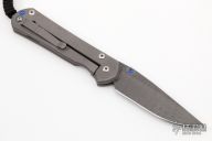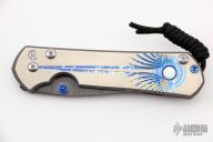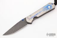 This large Sebenza 21 from Chris Reeve Knives features a Damascus blade with a unique milled and anodized titanium frame with mother of pearl inset and lanyard in pommel. Includes original leather sheath. Excellent condition.