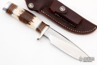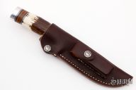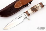 The Model 25-5 by Randall Made Knives is a drop point hunter similar to Model 11, but handle construction is reminiscent of 1930′s design. Excellent skinning, outdoors knife. This knife has a blade with notched thumbrest, .187" blade stock and 1.298" blade depth, hidden tang construction. The handle nickel guard and duralumin pommel, stag grip with stacked leather, black and duralumin spacers. Comes with brown leather sheath. New from maker. Comes with original paper wrapping.