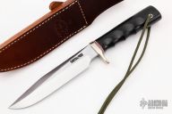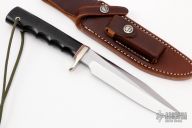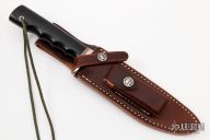 This Model 5 Camp and Trail Knife by Randall Made Knives features a satin finished blade with false top edge and notched thumbrest, .208" blade stock and 1.178" blade depth, hidden tang construction. The handle has a nickel silver single guard and a black linen micarta grip with black and duralumin spacers and a compass in the butt. Comes with a brown leather sheath with belt loop and original paper wrapping. New from maker.
