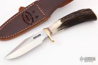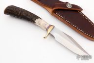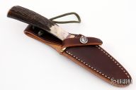 This Model 8-4 by Randall Made Knives features a satin finished blade with sharpened top edge, .158" blade thickness, 1.050" blade depth, hidden tang construction. Especially suitable for small fish and feathered game. Brass guard and stag grip with red/white/blue spacers. Comes with a brown leather sheath and original paper wrapping. New from maker.