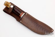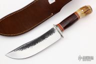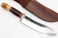 This 6.5" Hammer Mark Wood Craft by Jim Behring features a hammer mark and satin finished hollow ground upswept blade with a false top edge, .226" blade stock and 1.594" blade depth, hidden tang construction. The handle is Scagel style with a nickel silver guard, black/aluminum/red/yellow spacer pattern, horsehide stacked leather, real red stag in pommel and a musk ox bark butt plate. Great look and feel. Comes with brown leather sheath with ostrich leg panel. New from maker.