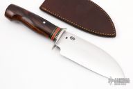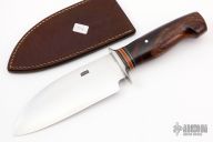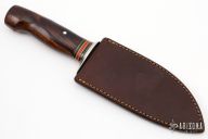 This Santoku Kitchen Knife by Jim Behring features a satin finished drop point blade with .1" blade stock and 2" blade depth, hidden tang construction. The handle features a nickel silver guard, black/brass/red/yellow spacer pattern, and premium iron wood handle. Great look and feel. Comes with brown leather sheath. New from maker.