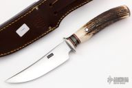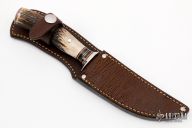 This Deer and Trout by Jim Behring features a satin finished upswept convex ground blade blade with .095" blade stock and 1.08" blade depth, hidden tang construction. The handle features a nickel silver guard, black/brass/red/yellow spacer pattern, and sambar stag handle with musk ox butt plate. Great look and feel. Comes with brown leather sheath with shark skin panel. New from maker.