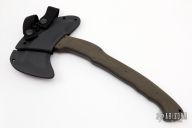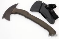 The WK RnD Axe Series is a collaborative design between Master Bladesmith Daniel Winkler and skilled Sayoc Kali martial arts trainer Rafael Kayanan. The full-size model is the most tested and highly developed axe produced by Winkler Knives, and has been proven in combat applications by a Special Operations Force Team. It is a favorite among operators and servicemen who choose their own equipment. The handle design provides a standard grip position, as well as a secondary close quarter grip that was developed to emulate the feel of a handgun grip. Axe Specifications Axe steel: 80CrV2 Black oxide no-glare finish Head length: 6" Overall length: 13 1/8" Blade thickness: 3/8" Skeletonized full tapered tang Optional Front Spike Sheath Fast draw carrier Lined Kydex® HD shockcord quick-release retention system Nylon belt straps with Mil-Spec Pull-The-Dot™ snaps Designed for multiple carry options (See our Info page for carry options) Comes with the original packaging. New from maker.