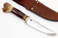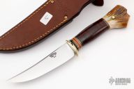 This Bird and Trout by Jim Behring features a satin finished upswept convex ground blade blade with .095" blade stock and 1.01" blade depth, hidden tang construction. The handle is Scagel style and features a brass guard, black/brass/red/yellow spacer pattern, horsehide stacked leather, real red stag crotch butt. Great look and feel. Comes with brown leather sheath. New from maker.