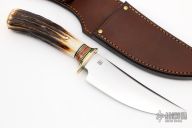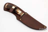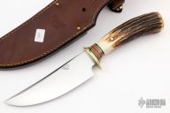 This Big Bay Hunter by Jim Behring features a satin finished upswept convex ground blade blade with false top edge, .156" blade stock and 1.48" blade depth, hidden tang construction. The handle features a brass guard, black/brass/red/yellow spacer pattern, real red stag handle with pinned brass butt plate. Great look and feel. Comes with full stitch brown leather sheath. New from maker.