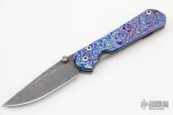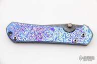 This Large Sebenza 31 by Chris Reeve Knives features a Raindrop Damascus blade and mokuti front scale. Has the original titanium lockside. Has dual thumbstuds and a tip up clip. Has some scuffs and scratches, otherwise excellent condition.