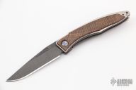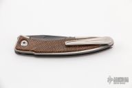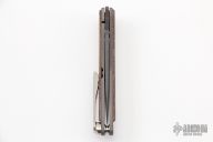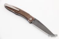 This Mnandi by Chris Reeve Knives features a clip point Damascus blade with thumb grooves. The handle has wood scales over a titanium frame and single backspacer. The machined titanium pocket clip is positioned for tip up, right hand carry. Includes original leather slip sheath. Excellent Condition.