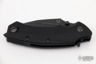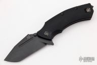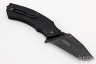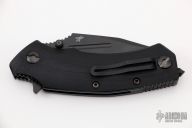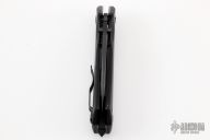 The Fox FKMD B.R.I. Knife is a bulldog of a tactical knife, designed by Stephane Ballarin, and manufactured by the Fox Knives Military Division. The B.R.I. (Brigade de Recherche et d'Intervention - the French Special Forces Unit), features a 3.5" clip point blade made of N690Co stainless steel, .15" thick, with a non reflective black finish, a top swedge and a fuller. The blade has a notched thumb rest for secure grip, dual thumb studs and a flipper for ambidextrous one hand opening. The black G10 handle, 4.8" closed, has steel liners for strength, a liner lock, and a glass breaker / impact weapon at the pommel. A side to side reversible pocket clip is mounted at the butt end. The FKMD B.R.I. has an overall open length of 8.3", and it weighs 8.5 ounces. Made in Italy. Has some light scuffs, otherwise excellent condition.