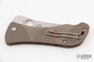 This "Hundred Pacer" by Spyderco features a satin finished blade with thumbhole. The handle has brown/tan G-10 scales with an inlaid stainless steel liner, tip up reversible stainless steel clip. Excellent condition.