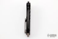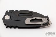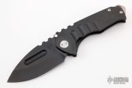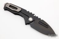 This Praetorian Genesis T from Medford Knife and Tool features a PVD coated drop point, style blade with fuller, notched thumb rest and dual thumb studs. The handle has a black titanium frame over a D2 backspacer/glass breaker. Stonewash titanium tip up clip. Great blade seating, detent and lock up. Has a couple light scuffs, otherwise excellent condition.