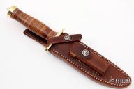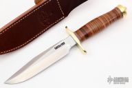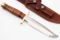The Model 1 Fighter by Randall Made Knives has a satin finished blade with sharpened top edge, .205" blade stock and 1.194" blade depth, hidden tang construction. The handle has a brass double guard, stacked leather finger grip handle with red/white/blue spacers, brass butt. Comes with a brown leather sheath and original paper wrapping. New from maker.