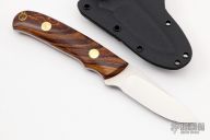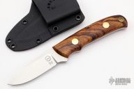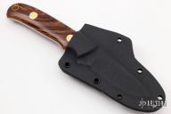 This K-14 by Dozier knives has a satin finished drop point blade with full tang construction. .123" blade depth and .845" blade stock. Has ironwood scales with brass pins and lanyard hole. Comes with a kydex sheath. New from maker.