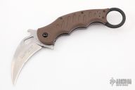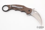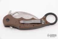 This folding Karambit by Fox Cutlery features a stonewashed hawkbill blade with thumbhole, notched thumbrest and wave feature. The handle has brown G-10 scales, black stainless steel liners and backspacer. Tip up left or right reversible stainless steel clip. Excellent condition.