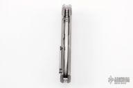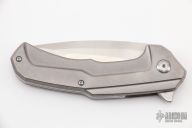 This Dynamic from Brous Blades features a satin finished multi-ground tanto blade with notched thumbrest and flipper. The handle is comprised of a bead blasted and milled titanium frame and backspacer, tip up stainless steel pocket clip. Excellent condition. Nice detent, lockup and blade seating. Rides on bearings.