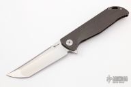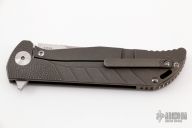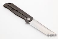 This K-2 from Reate Knives features a satin finished blade with false top edge, notched thumbrest and flipper. The handle has a milled and anodized titanium frame and tip up pocket clip, backspacer has been anodized blue. Nice detent, lockup and blade seating. Has a few light scuffs, otherwise excellent condition.