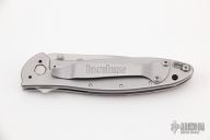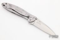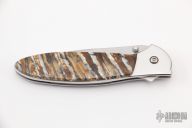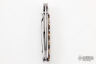 This Kershaw assisted opening flipper has been customized by Santa Fe Stoneworks, it features a bead blast blade and back side of the stainless steel frame. mammoth tooth scale on front of handle, tip up or down reversible stainless steel clip. Nice lock up, blade seating and detent. Excellent Condition.