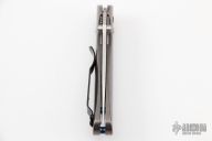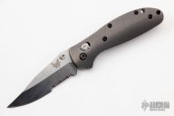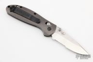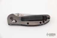 This Mini Griptilian by Benchmade features a satin finished partially serrated blade with notched thumbrest and dual thumbstuds. The handle has tumbled titanium scales, stainless steel liners and tip up clip. Excellent condition.