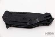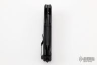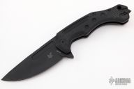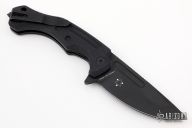 This FX-520 by Fox Cutlery features a black blade with notched thumbrest, fullers and flipper. The handle has black G-10 scales and backspacer, black stainless steel liners and tip up clip. Nice detent, lockup and blade seating. Has some light scuffs on the blade, otherwise excellent condition.