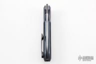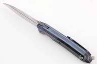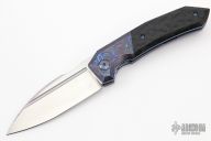 This Speartac by Grind Tactical features a hand rub satin finished blade with fullers and notched thumbrest and front flipper. The handle has zircuti bolsters, rain drop carbon fiber scales, anodized titanium liners, zircuti backspacer and tip up clip. Nice detent, lockup and blade seating. Excellent condition.