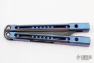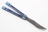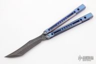 This Monarch balisong by JK Design features a milled, acid wash, upswept recurve clip point bade. The handles are comprised of two-tone Zirblast with light blue anodization finish titanium with milled short speed channel, bronze phosphorus washers and steel bushings. Marked JK|JH on the handle. Comes with Zipper case, makers card, and stickers. New from Maker.