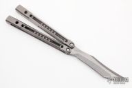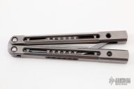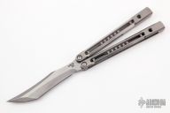 This Monarch balisong by JK Design features a milled, stone wash finish, upswept recurve clip point bade. The handles are comprised of two-tone Zirblast finish titanium with milled short channel, bronze phosphorus washers and steel bushings. Marked JK|JH on the handle. Comes with Zipper case, makers card, and stickers. New from Maker.