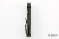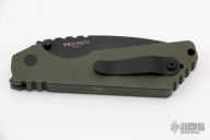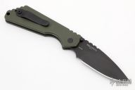 This Pro-Strider SNG by Pro-Tech and Strider Knives features a black blade with notched thumbrest. The handle has a green aluminum frame with black hardware and black stainless steel tip up clip. Scuffs and scratches are visible on the handle and blade, has been resharpened. Good functioning condition.