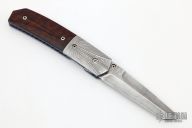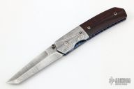 This tanto linerlock features a Damascus blade and bolsters. Scales are wood with matching carved in matching patterns. Thumbstud has matching wood insert. Liners are anodized titanium with jeweling and filework. Backspacer is also fileworked. Comes with a zipper case. Slight signs of oxidation on small area of blade and small spots on one bolster otherwise excellent condition.