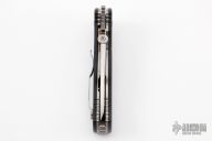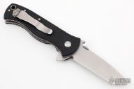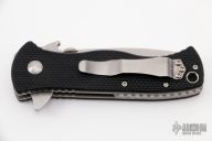 This XHD-7F-SF by Emerson Knives features a satin and stonewashed chisel ground blade with thumbdisc, wave feature, notched thumbrest and flipper. The handle has textured black G-10 scales, tumbled titanium liners and notched backspacer, lanyard hole, tip up reversible stainless steel clip, stainless steel lockface insert. Rides on bearings, nice detent, lockup and blade seating. Comes with original box and papers. #0187 on blade. Excellent condition.