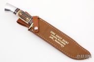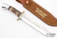 This knife by Western Cutlery is over 30 years old. Mirror polished bowie blade with fullers, .153" blade stock and 1.267" blade depth, full tang construction. The handle has a brass guard, stag handle with black/white/red spacers and an aluminum butt. Comes with a brown leather sheath. Blade stamped "WESTERN U.S.A. W46-8 N". The blade is marked "50th Anniversary Lander, WYO. 1940-1990. Has some light staining on the blade, otherwise excellent condition.