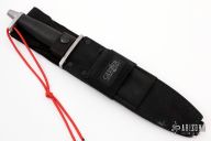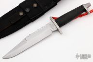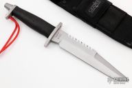 Hard to find sawtooth BMF by Gerber has been out of production for many years. Blade is bead blasted as are the guard and butt cap. .246" thick and 1.482" deep. Non-skid handle. Comes with original sheath. Has scratches, the sawteeth have been modified slightly on the corners, otherwise good user condition. Highly desirable tactical knife. #018970.