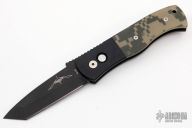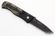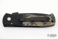 This CQC7 Side Opening Auto has a black finished 154-CM chisel ground tanto blade with notched thumb rest. Handle is black aluminum with DigiCam G10, lanyard hole, and black stainless steel tip up clip. Comes with nylon velcro sheath and original box and papers. Excellent condition. PR6 #317
