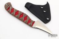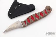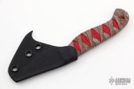 This fixed blade from Bantang Knives features a reverse upswept style chisel ground titanium blade. 0.075" Blade Stock and .938" Blade Depth. The handle is comprised of black Japanese style wrap over red cord wrap and hidden tang construction. Includes kydex pocket sheath. This would make an excellent fruit knife. Excellent Condition.