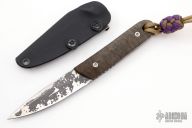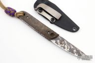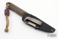 This Small Kwaiken by Steve Ryan features a splatter/distressed/acid finish blade with notched thumbrest, .156" blade stock and .93" blade depth, full tang construction. The handle has textured micarta scales and lanyard hole with lanyard. Comes with a kydex sheath with Mummert clip . Excellent condition.