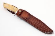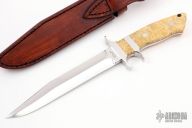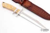 This Loveless Style Sub-Hilt Fighter by Deon Nel features a a mirror polished blade with a sharpened top edge, .247" blade stock and 1.218" blade depth, full tapered tang construction. The handle has a mirror polished 303 stainless steel guard and sub-hilt, stabilized Bird's Eye Maple Burl scales with red liners. Comes with a nice hand tooled brown leather sheath. Dated 2021. New condition.