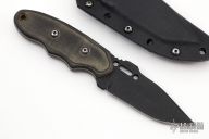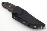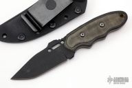 This Tracker Scout by Tops knives features a black coated blade with notched thumbramp, .159" blade stock and 1.33" blade depth, full tang construction. The handle has micarta scales, white liners. Comes with a kydex sheath. Great condition.