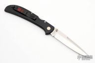 This Talon by Al Mar features a satin finished blade with false top edge and dual thumbstuds. The handle has black linen micarta scales with tip up black stainless steel clip, left/right reversible. Has some light scratches, otherwise excellent condition. Comes with a zippered case.