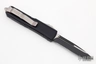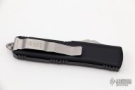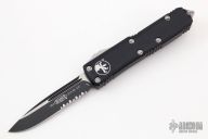 This UTX-85 by Microtech features a black partially serrated blade. The handle has a black aluminum frame with blasted hardware and tip down clip. Comes with original box and papers. Dated 01/2018 and s/n 10359. Excellent condition.