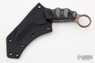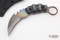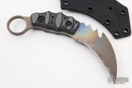 This MSC PS Karambit by Mick Strider features a Strike Plate Titanium chisel ground blade with carbidized edge, .214" blade stock and 1.277" blade depth, full tang construction. The handle has black/tan G-10 scales, ring at the butt. Comes with kydex sheath. New condition.