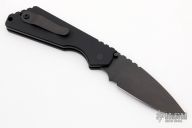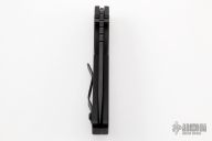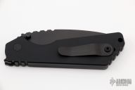 This Pro-Strider SNG by Pro-Tech and Strider Knives features a black blade with notched thumbrest. The handle has a black aluminum frame with black hardware and black stainless steel tip up clip.  There is a tritium lantern inlaid into the push button.  Comes with original box and papers. New from maker.