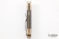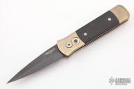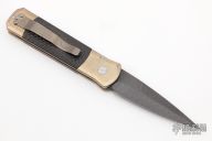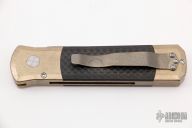 This Godson from Pro-Tech Knives features a Vegas Forge Herringbone Damascus blade with swedge. The handle has a stonewashed bronze frame with carbon fiber inlays, carbon fiber button, bronzed and stonewashed tip up clip. New From Maker! Comes with original box and papers.